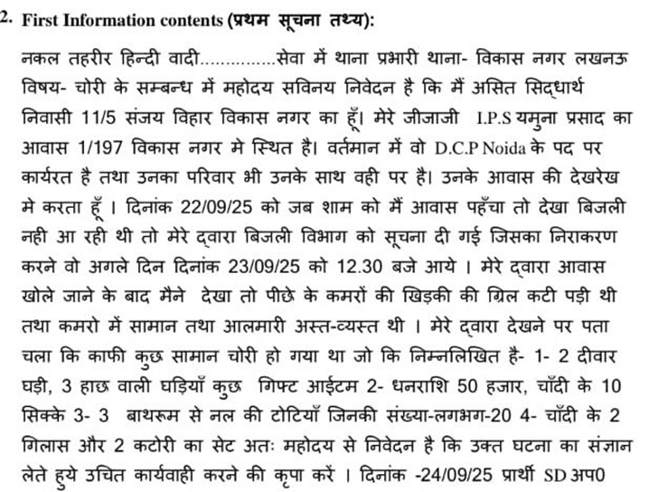 लखनऊ। राजधानी के विकास नगर इलाके में चोरों ने आईपीएस अधिकारी यमुना प्रसाद के घर को निशाना बनाया। यमुना प्रसाद इस समय नोएडा में डीसीपी पद पर तैनात हैं। उनका लखनऊ स्थित आवास (1/197, विकास नगर) लंबे समय से खाली था।