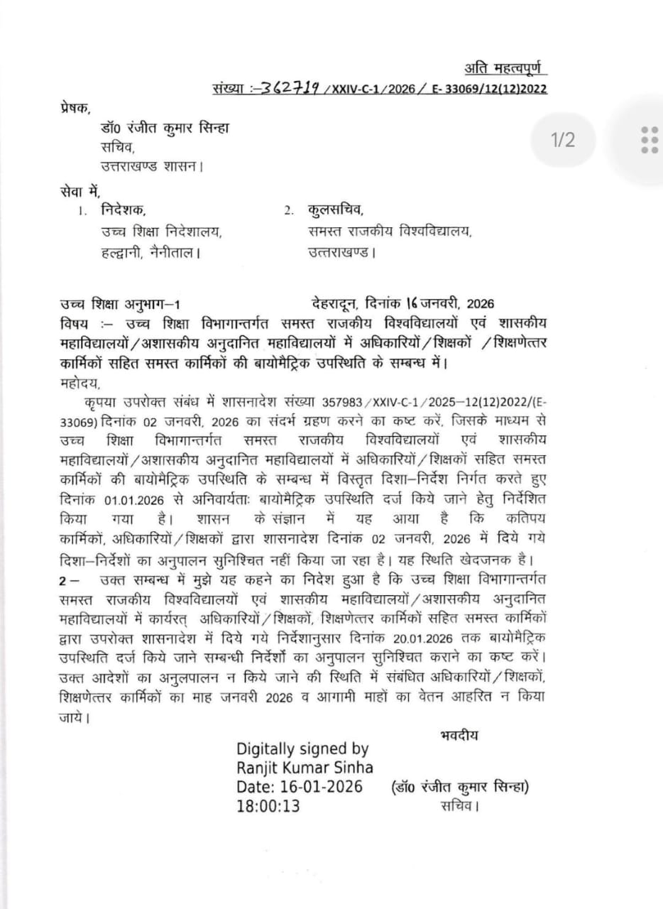 देहरादून। अब प्रदेश के समस्त अशासकीय, राजकीय महाविद्यालयों और सभी विश्वविद्यालयों में शासन द्वारा बायोमेट्रिक उपस्थिति अनिवार्य कर दी गई है।