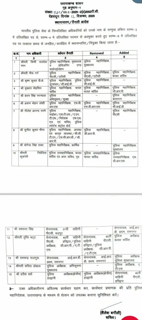 हरीश वर्मा को SP (R-हल्द्वानी) से हटाकर 40वीं PAC बटालियन, हरिद्वार का कार्यभार दिया गया।