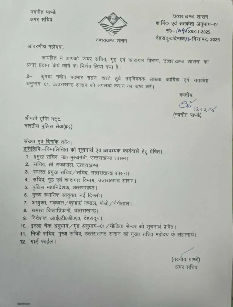तृप्ति भट्ट को शासन में अपर सचिव (Jail) बनाए जाने के साथ-साथ Fire Service की जिम्मेदारी भी दी गई है।