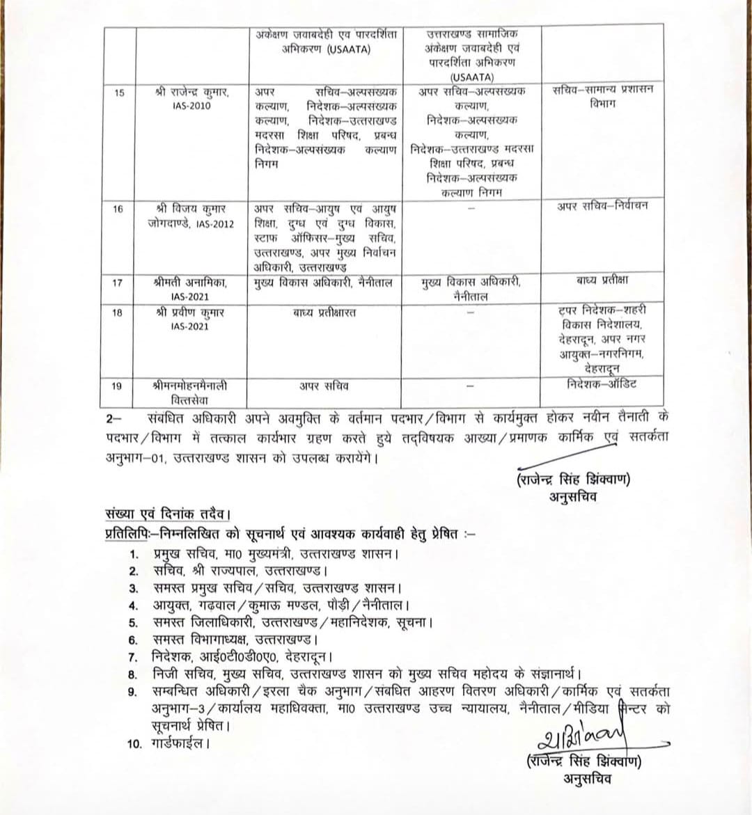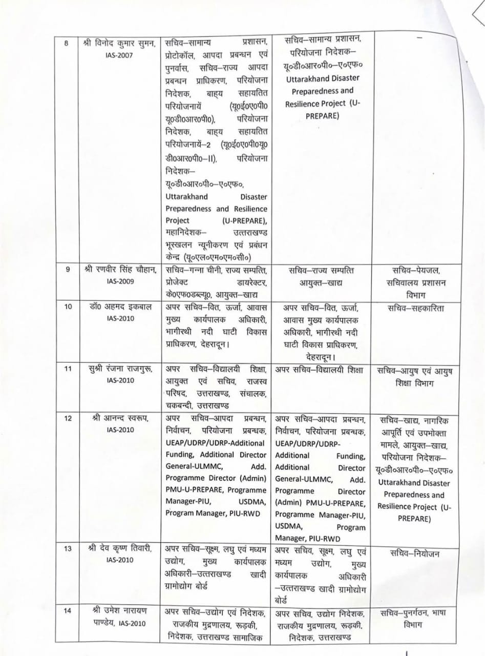 मुख्यमंत्री पुष्कर सिंह धामी सरकार ने शनिवार देर शाम एक साथ 19 आईएएस अधिकारियो के दायित्वों में फेरबदल कर डाले। आगामी विधानसभा चुनाव की तैयारियों के मद्देनजर सरकार ने प्रशासनिक दायित्वों में बदलाव कर पुख्ता तैयारियों के संकेत भी दिये हैं। क्योंकि, प्रशासनिक बदलावों की अनिवार्यता का पालन करने के साथ ही चहेते अधिकारियों को एडजस्ट किया गया है और काबलियत के हिसाब से भी महकमे बांटे गए हैं। सरकार ने हरफनमौला वरिष्ठ आईएएस अधिकारी प्रमुख सचिव आर मीनाक्षी सुंदरम को कुछ हल्का करते हुए उनसे आवास विभाग और इससे जुड़े अन्य दायित्व वापस लिए हैं, जबकि उनके पास मुख्य कार्यकारी अधिकारी हरिद्वार ऋषिकेश गंगा परियोजना जैसी दूरगामी योजना का जिम्मा बरकरार रखा है। ताकि वह इस परियोजना पर पूरा ध्यान केंद्रित कर सकें। साथ ही ऊर्जा जैसा अहम दायित्व भी सुंदरम के पास बरकरार रखा गया।