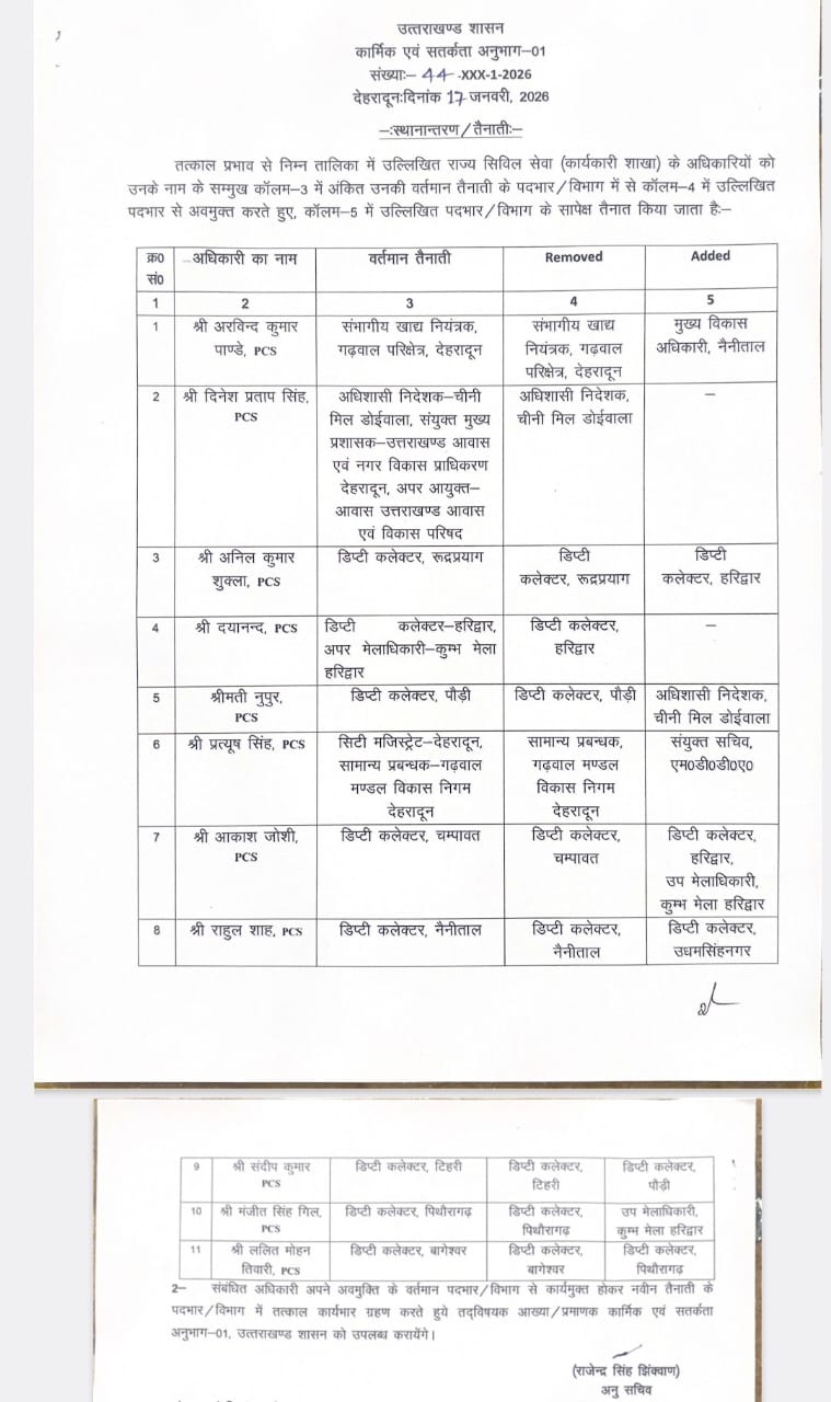 शासन ने 11 पीसीएस अधिकारियों के दायित्व में भी बदलाव किए हैं। जिसमें मुख्य रूप से तेज तर्रार अधिकारी देहरादून के सिटी मजिस्ट्रेट प्रत्यूष सिंह से जीएमवीएन के जीएम की जिम्मेदारी वापस लेकर एमडीडीए के संयुक्त सचिव का दायित्व जोड़ा गया है।