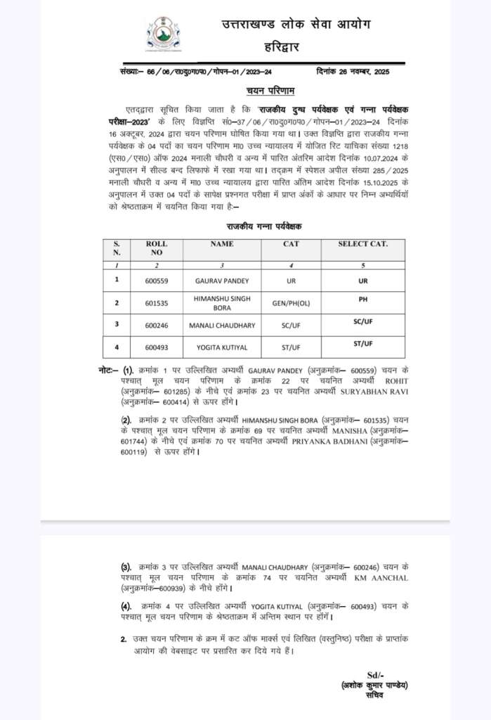 एतद्वारा सूचित किया जाता है कि राजकीय दुग्ध पर्यवेक्षक एवं गन्ना पर्यवेक्षक परीक्षा-2023′ के लिए विज्ञप्ति सं0-37/06/रा०दु०ग०प०/ गोपन-01/2023-24 दिनांक 16 अक्टूबर, 2024 द्वारा चयन परिणाम घोषित किया गया था। उक्त विज्ञप्ति द्वारा राजकीय गन्ना पर्यवेक्षक के 04 पदों का चयन परिणाम मा० उच्च न्यायालय में योजित रिट याचिका संख्या 1218 (एस०/एस०) ऑफ 2024 मनाली चौधरी व अन्य में पारित अंतरिम आदेश दिनांक 10.07.2024 के अनुपालन में सील्ड बन्द लिफाफे में रखा गया था। तद्क्रम में स्पेशल अपील संख्या 285/2025 मनाली चौधरी व अन्य में मा० उच्च न्यायालय द्वारा पारित अंतिम आदेश दिनांक 15.10.2025 के अनुपालन में उक्त 04 पदों के सापेक्ष प्रश्नगत परीक्षा में प्राप्त अंकों के आधार पर निम्न अभ्यर्थियों को श्रेष्ठताक्रम में चयनित किया गया है:-