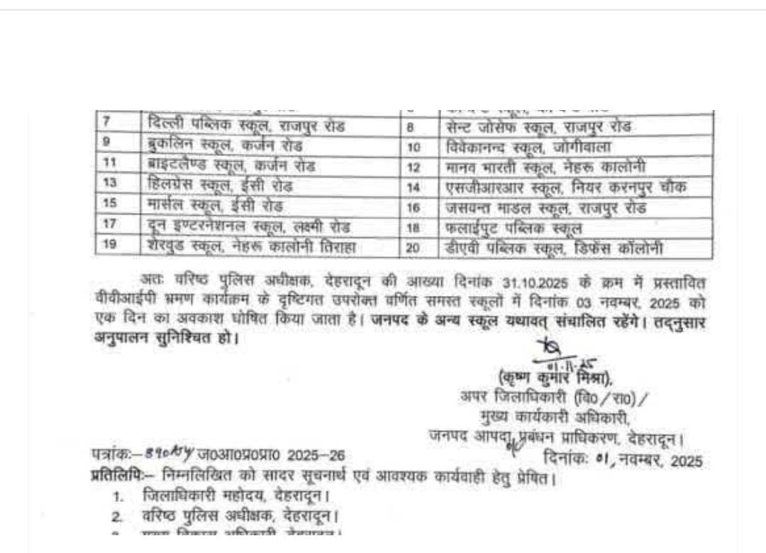 वरिष्ठ पुलिस अधीक्षक, देहरादून की आख्या दिनांक 31.10.2025 के क्रम में प्रस्तावित वीवीआईपी भ्रमण कार्यक्रम के दृष्टिगत उपरोक्त वर्णित समस्त स्कूलों में दिनांक 03 नवम्बर, 2025 को एक दिन का अवकाश घोषित किया जाता है। जनपद के अन्य स्कूल यथावत् संचालित रहेंगे। तद्नुसार अनुपालन सुनिश्चित हो।