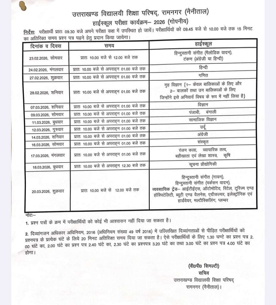 उत्तराखण्ड विद्यालयी शिक्षा परिषद, रामनगर (नैनीताल) द्वारा संचालित हाईस्कूल एवं इण्टरमीडिएट की सैद्धान्तिक परीक्षाएं दिनांक 21 फरवरी, 2026 से आरम्भ होकर 20 मार्च, 2026 को सम्पन्न होंगी। हाईस्कूल एवं इण्टरमीडिएट 2026 की प्रयोगात्मक परीक्षाएं दिनांक 16 जनवरी, 2026 से 15 फरवरी, 2026 के मध्य सम्पादित की जायेगी। बैठक में परिषद् के सभापति डॉ० मुकुल कुमार सती, सचिव विनोद प्रसाद सिमल्टी एवं परीक्षा समिति के सदस्य उपस्थित रहे।
