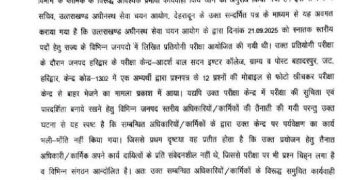 स्नातक स्तरीय परीक्षा के सम्बन्ध में जनपद हरिद्वार के परीक्षा केन्द्र आदर्श बाल सदन इण्टर कॉलेज, ग्राम्य व पोस्ट बहादरपुर, जट में तैनात सेक्टर मजिस्ट्रेट श्री के०एन० तिवारी, परियोजना निदेशक, जिला ग्राम्य विकास अभिकरण, हरिद्वार को प्रथमदृष्टया ड्यूटी में लापरवाही का दोषी पाये जाने पर निलम्बित किया गया है।