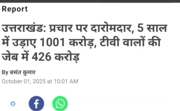 देहरादून। विकास के तमाम दावे करने वाले और पिछले विधानसभा चुनाव में हार चुके मुख्यमंत्री पुष्कर सिंह धामी ने गोदी चैनलों पर अपने ‘विकास’ के दावों पर खर्च करने के लिए जनता के 1 हजार करोड रुपए से अधिक की धनराशि खर्च कर दी है।
